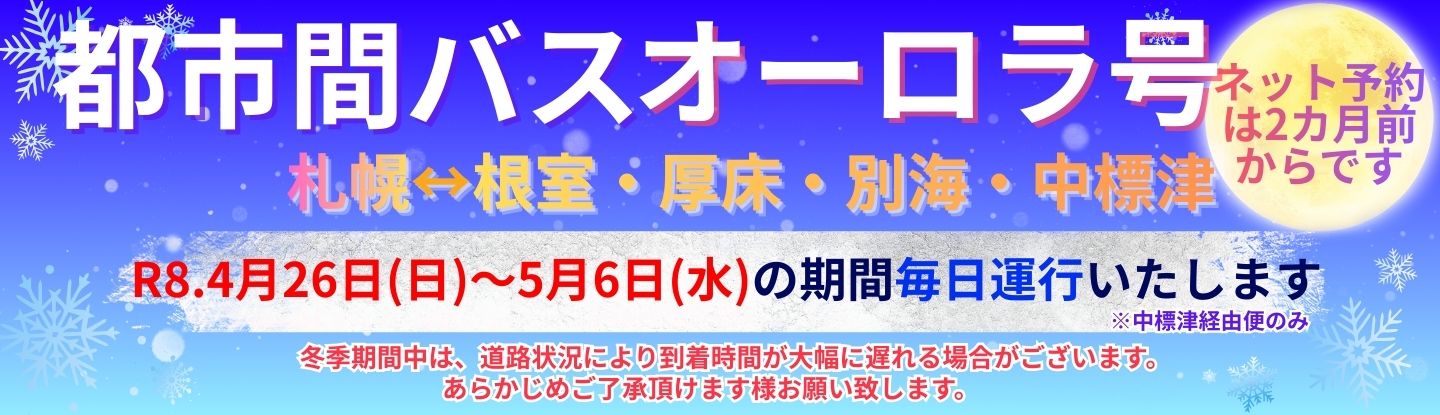 お知らせ・路線運行情報 2026.3.2 2026年3月~5月 札幌線「オーロラ号運行カレンダー」 2026.3.1 定期観光バス【のさっぷ号】令和8年5月1日より運行開始 2026.2.26 R8.4/1(水) 釧路⇔根室 特急『ねむろ号』【茶内バス停】バス停変更のお知らせ 2026.2.26 バス運賃改定の詳細について 2026.2.16 『山花温泉リフレ』日帰り入浴温泉バスツアー開催のお知らせ 2026.1.9 根室市高齢者バス等優待乗車券(70歳以上)お持ちの方へのお知らせ 2025.12.29 R8.2/1以降の中標津空港線時刻表期限更新についてのお知らせ 2025.12.28 バストランクルーム持込制限について 2025.12.22 バス運賃改定のお知らせ 2025.10.28 2025年12月~2026年2月 札幌線「オーロラ号運行カレンダー」 Tweets by n_k_saishin 都市間バス案内 時刻表 Nemuro kotsu offers unique regular tourist bus services in summer and winter. Select Language (Links to external) English 简体中文 繁體中文 한국 日本語