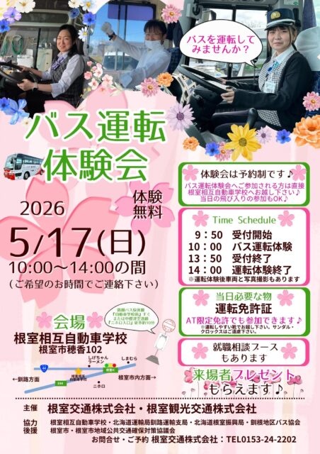 2026.5/17(日)10時~14時 根室相互自動車学校にて『バス運転体験会』を 開催致します!自動車普通免許をお持ち …